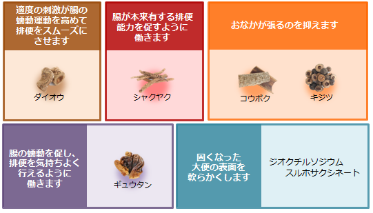 ○便秘に伴う次の症状の緩和:頭重、のぼせ、肌あれ、吹出物、食欲不振(食欲減退)、腹部膨満、腸内異常醱酵、痔