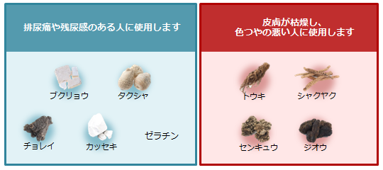体力に関わらず使用でき、皮膚が乾燥し、色つやが悪く、胃腸障害のない人で、排尿異常があり口が渇くものの次の諸症:排尿困難、排尿痛、残尿感、頻尿